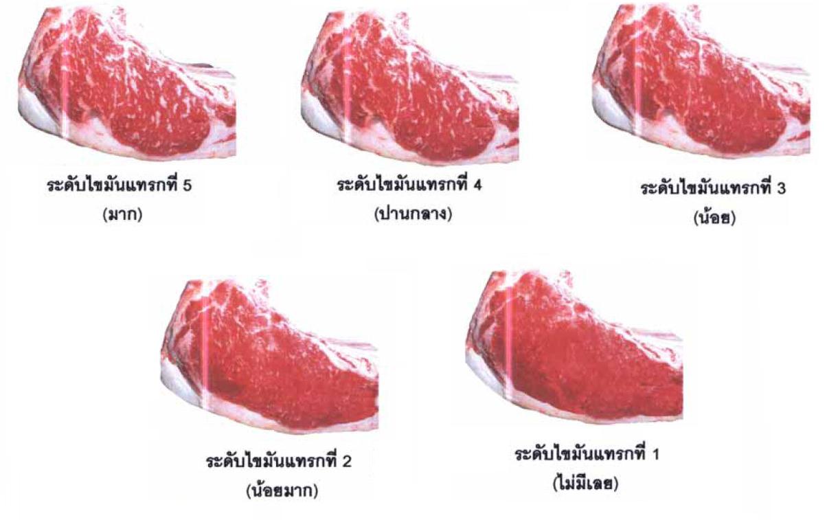 ไขมันสีขาวแทรกอยู่ในมัดกล้ามเนื้อที่มองเห็นได้ด้วยตาเปลา เป็นเส้นเล็กๆ กระจายตัวอยู่ภายในกล้ามเนื้อ จนมีลักษณะคล้ายกับลายหินอ่อนไขมันที่แทรกอยู่ในมัดกล้ามเนื้อนี้ทำให้เนื้อมีความนุ่มขึ้น ช่วยให้หล่อลื่นในขณะที่เคี้ยวและกลืนเนื้อ และช่วยกระตุ้นการหลั่งน้ำลาย จึงทำให้เกิดความรู้สึกชุ่มน้ำอยู่ในปาก เนื้อที่มีไขมันแทรกอยู่ภายในมัดกล้ามเนื้อทำให้รู้สึกชุ่มน้ำได้ดี เนื้อวัวที่มีเกรดสูงจะมีปริมาณไขมันแทรกกล้ามเนื้อมาก